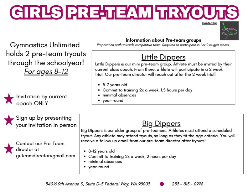 Gymnastics Unlimited hosts Pre-Team tryouts twice during the schoolyear! Tryouts are invitation by current coach only.